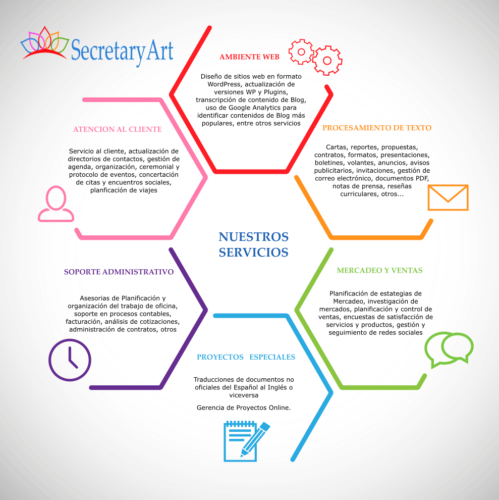 Cónsonos con este concepto, SecretaryArt es una agencia profesional de soporte administrativo online que te permite liberarte de las actividades que te restan tiempo valioso para que te dediques a las actividades medulares de tu negocio.